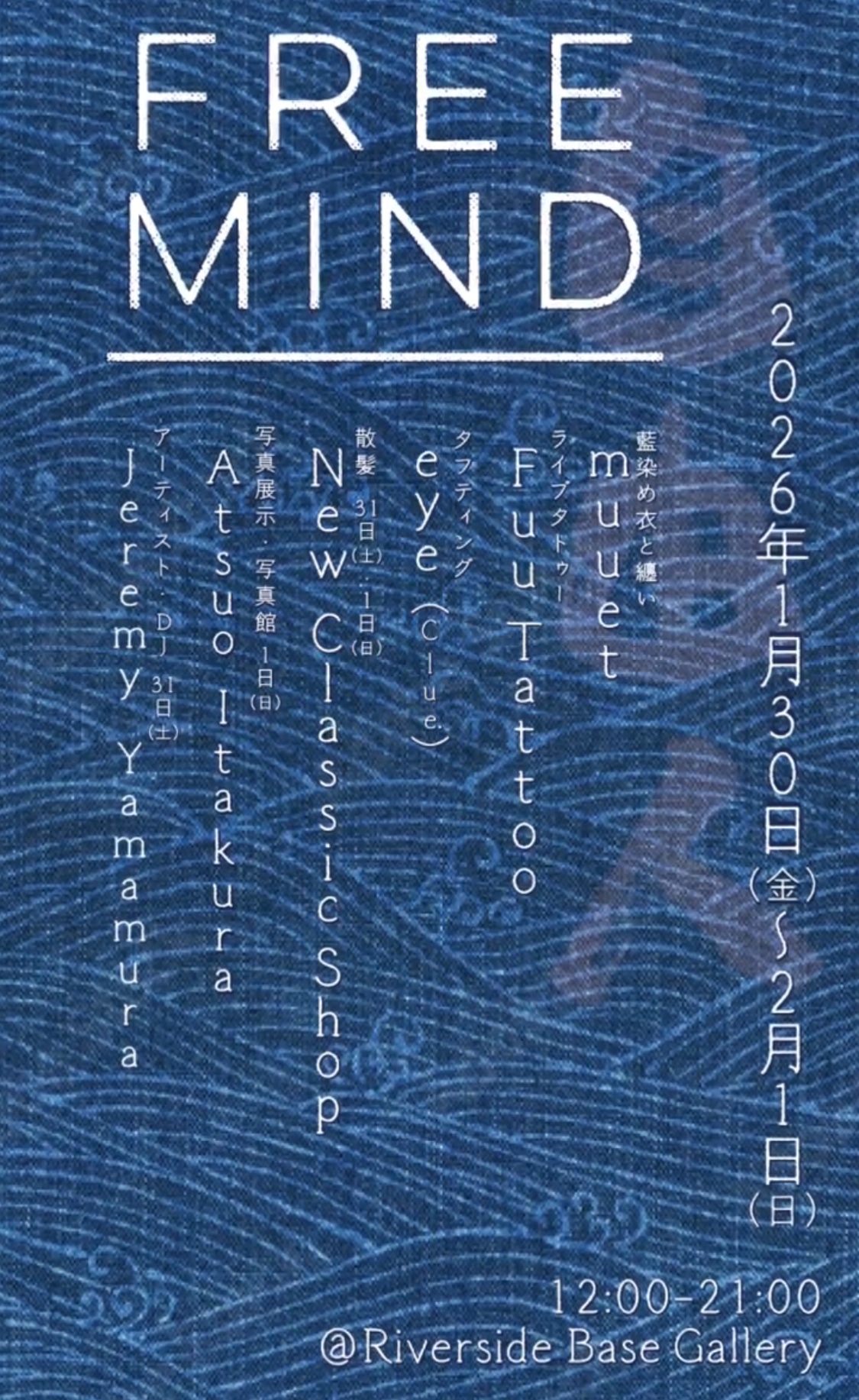 このたびRiverside Base Galleryでは、2026年1月30日(金)〜2月1日(日)の3日間、イベント「Free Mind Vol.2」を開催いたします。