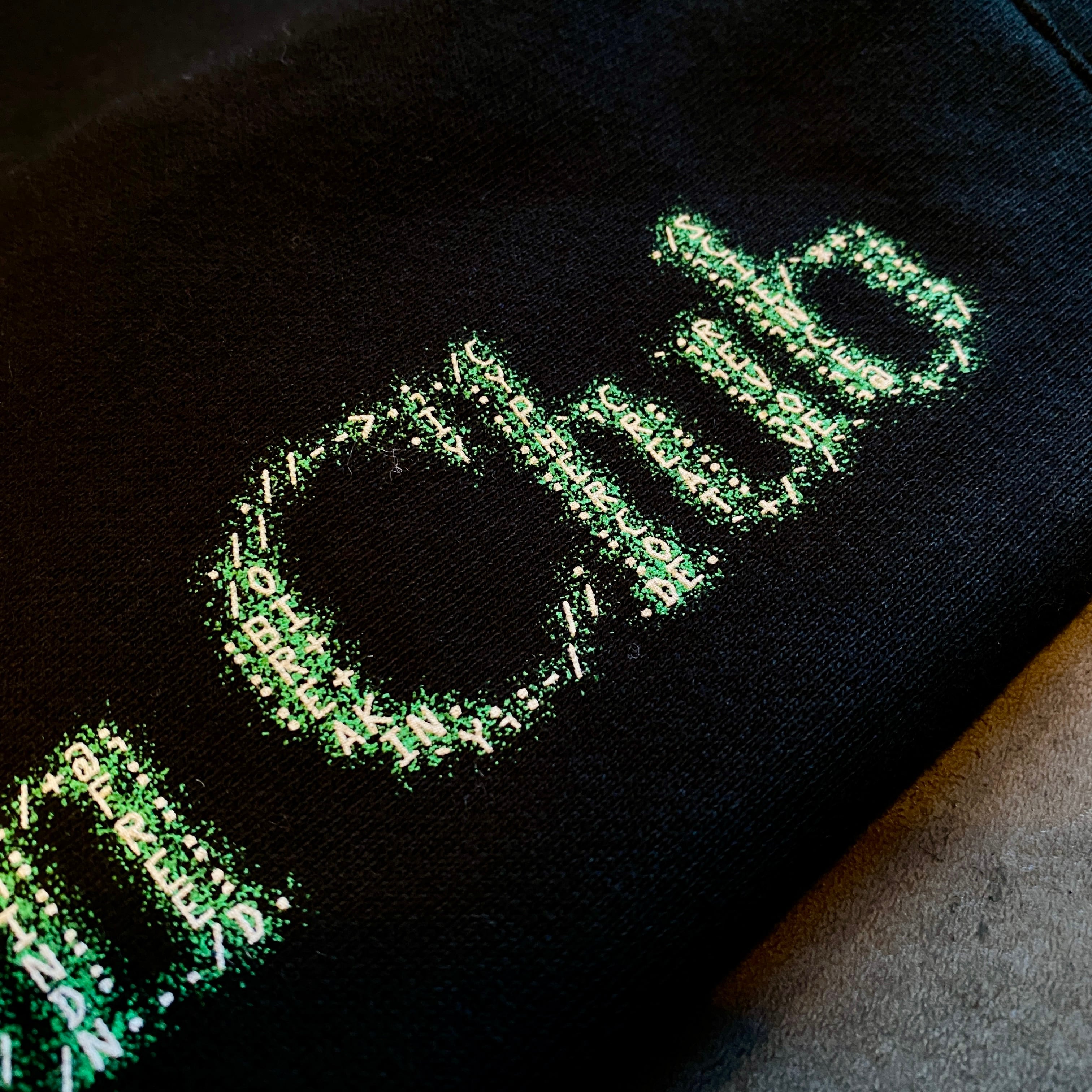 Break Innovation Clubの哲学=「創造」と「挑戦」を、暗号のように連なるグラフィックで表現したスウェットパンツ。